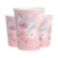8 papieren bekers in lichtroze met witte randen en afbeeldingen van schattige vlinders tussen bloemen. Zet ze neer om de tafelaankleding extra leuk te maken tijdens het kinderfeestje. De bekers zijn ongeveer 10 cm hoog en hebben een inhoud van ongeveer 250 ml.
