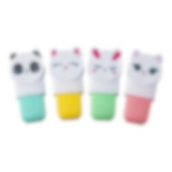 Set van 4 markeerstiften in mooie pastelkleuren, versierd met schattige afbeeldingen van katten en een panda op de doppen. Perfect om uitdeelzakjes mee te vullen voor een kinderfeestje met een dierenthema.