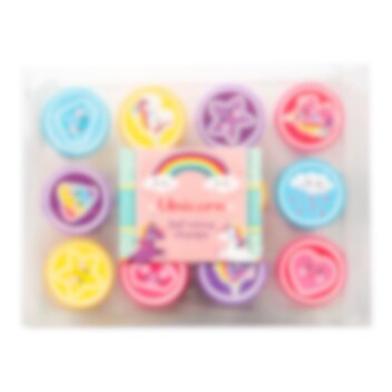 12 stempels in verschillende kleuren met schattige eenhoornafbeeldingen! Elke stempel is ongeveer 3,5 cm hoog.