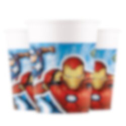 8 papieren bekers met kleurrijke afbeeldingen van Avengers, waarop Iron Man en Captain America duidelijk en dynamisch te zien zijn. Ideaal om een samenhangende en vrolijke tafelschikking te creëren voor een kinderfeestje met Avengers-thema.