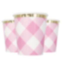8 papieren bekers in een roze en wit geruit patroon en met goudfolie randen. Een leuk tafelaccessoire voor het kinderfeestje. De bekers zijn ongeveer 10 cm hoog en hebben een inhoud van ongeveer 270 ml.