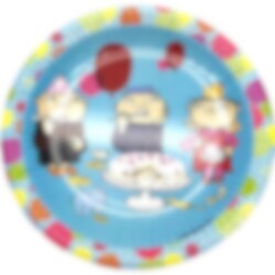 8 papieren bordjes met kleurrijke feestmotieven van Alfons en zijn vrienden Milla en Viktor uit de serie Alfons Alfrink. De bordjes hebben een diameter van 17,5 cm.