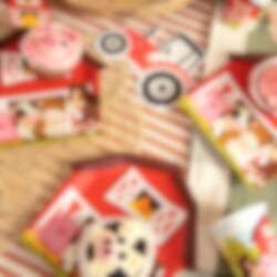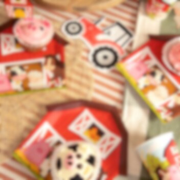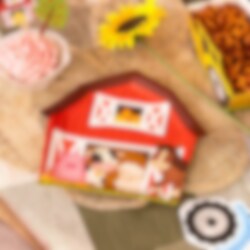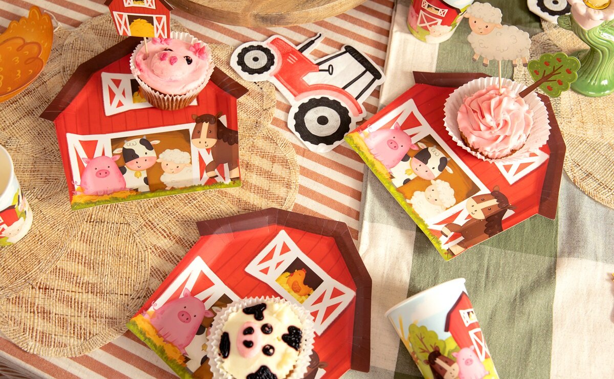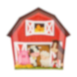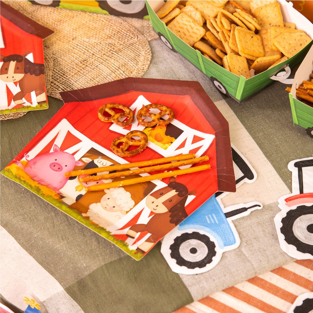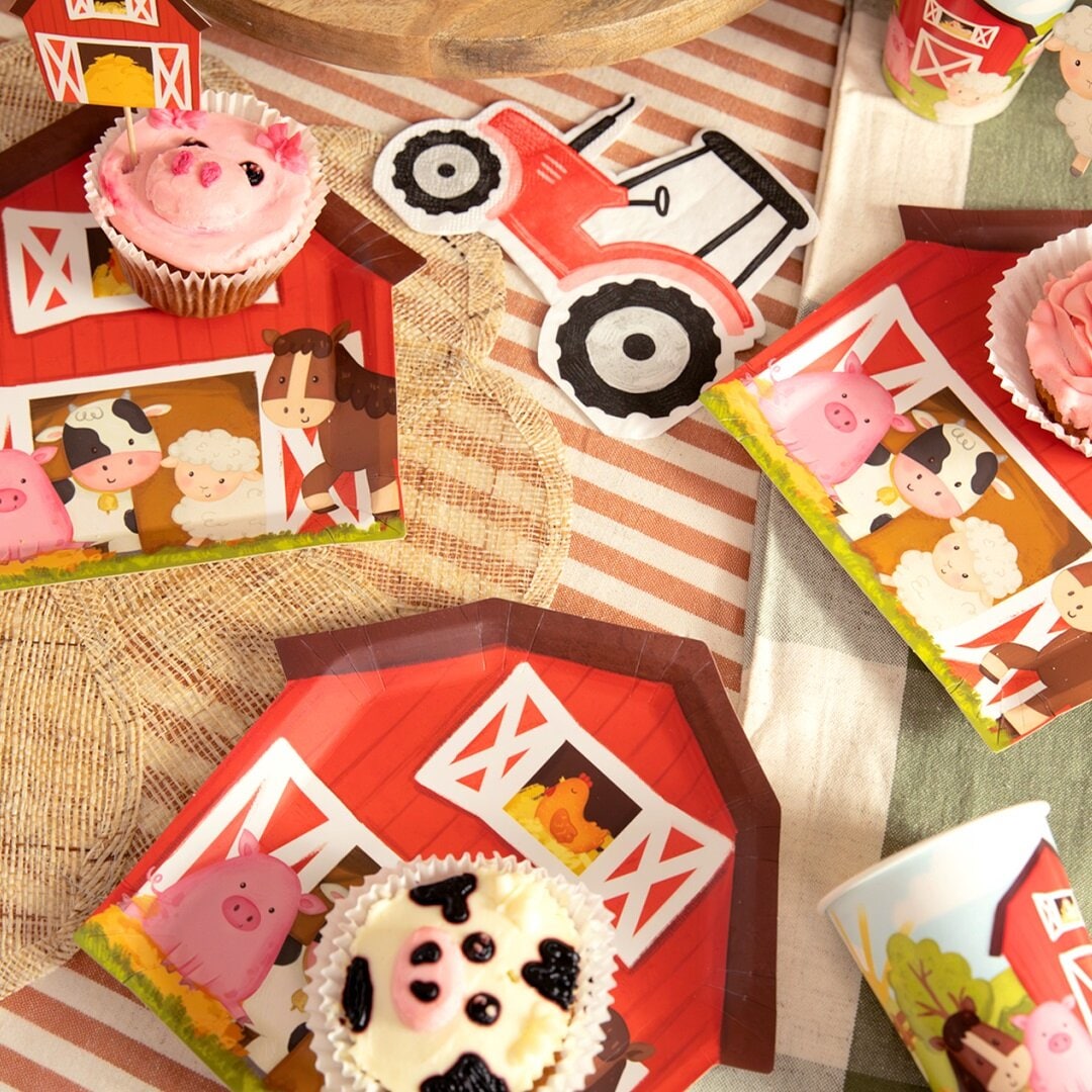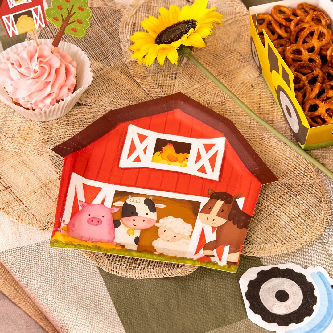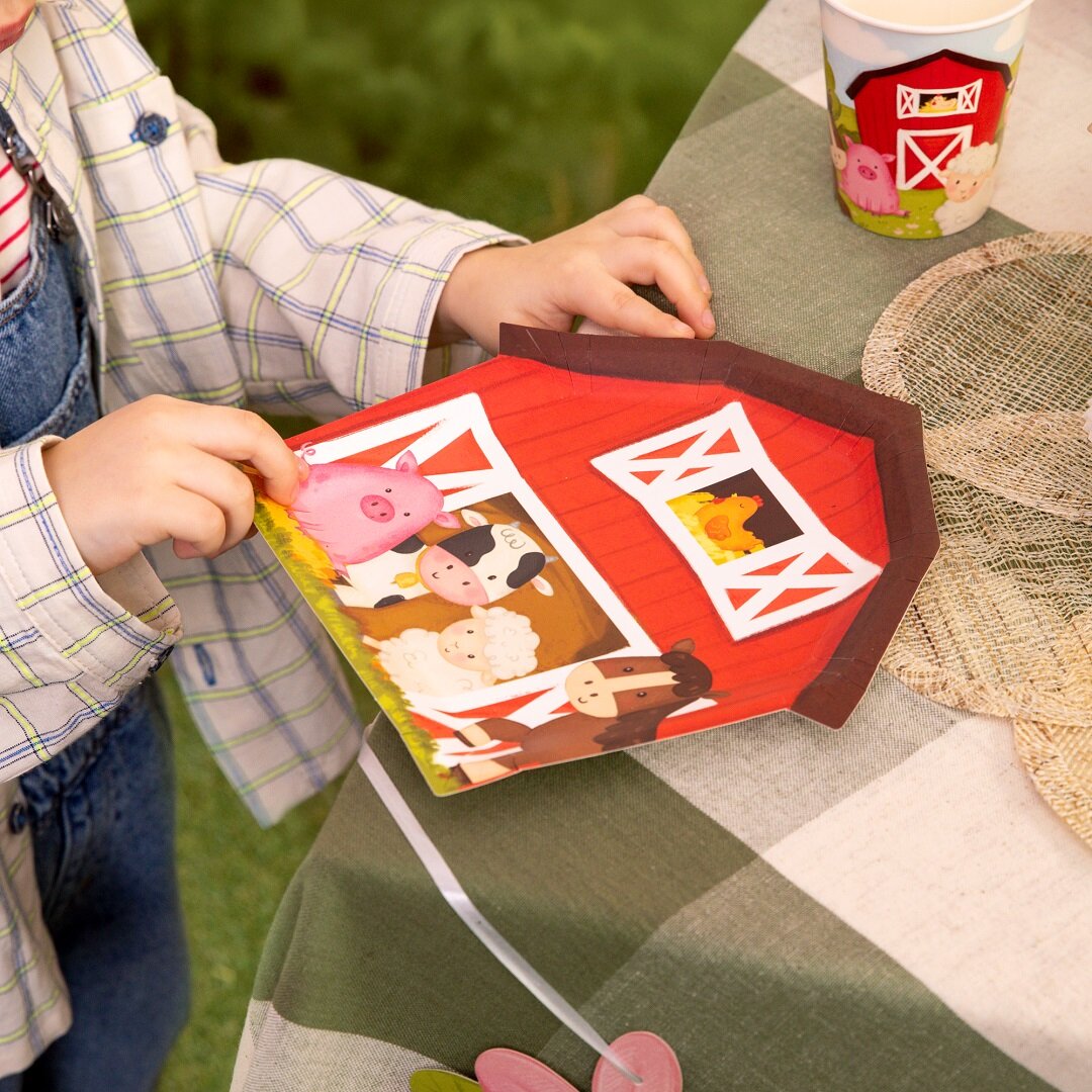 6 papieren bordjes in boerderijthema die de tafel extra feestelijk maken voor het kinderfeestje. De bordjes zijn gevormd als een rode schuur en versierd met schattige boerderijdieren zoals een varken, koe, schaap en paard, waardoor ze een speels detail vormen op de verjaardagstafel.