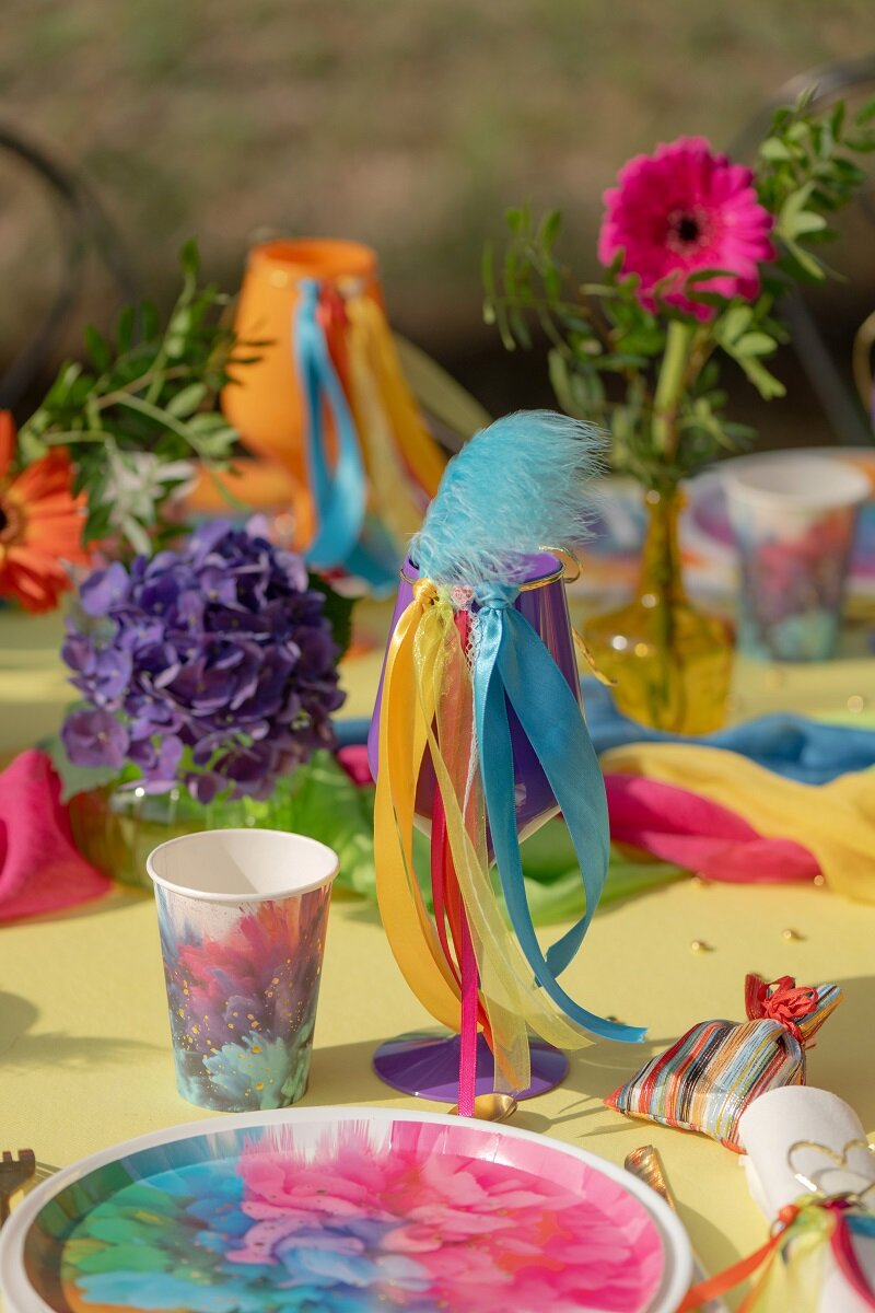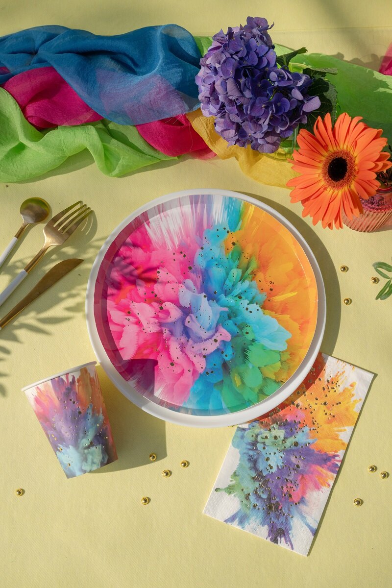Kleurrijke bordjes die perfect zijn voor een kinderfeestje, feestjes en andere vieringen waar de tafeldecoratie er echt uit mag springen. De afbeelding lijkt op een explosie van heldere kleuren in roze, blauw, groen en oranje, wat zorgt voor een levendige en decoratieve uitstraling. De glanzende gouden details voegen bovendien een elegante touch toe.