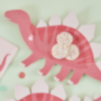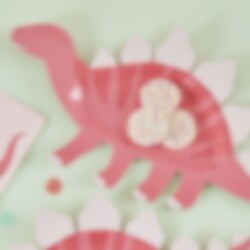 8 papieren bordjes in de vorm van een roze stegosaurus. Perfect om ook te gebruiken als serveerschaal voor het kinderfeestje met een leuk dino thema. De bordjes hebben een afmeting van ongeveer 30 x 16 cm.