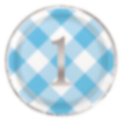 8 papieren bordjes in een blauw-wit geruite patroon met een zilverfolie in het midden en zilverfolie randen. Een stijlvol tafelaccessoire om mee te nemen naar het 1e verjaardagsfeestje. De bordjes hebben een diameter van ongeveer 23 cm.