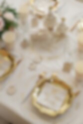 De borden hebben een decoratieve vorm met zacht golvende randen, wat een exclusieve indruk geeft. Ze passen perfect wanneer je de tafel wilt dekken met iets dat zowel feestelijk als doordacht is, ongeacht het type viering.