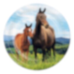 8 papieren bordjes met een schattige en realistische afbeelding van een merrie met haar veulen in de wei. De bordjes hebben een diameter van ongeveer 18 cm.