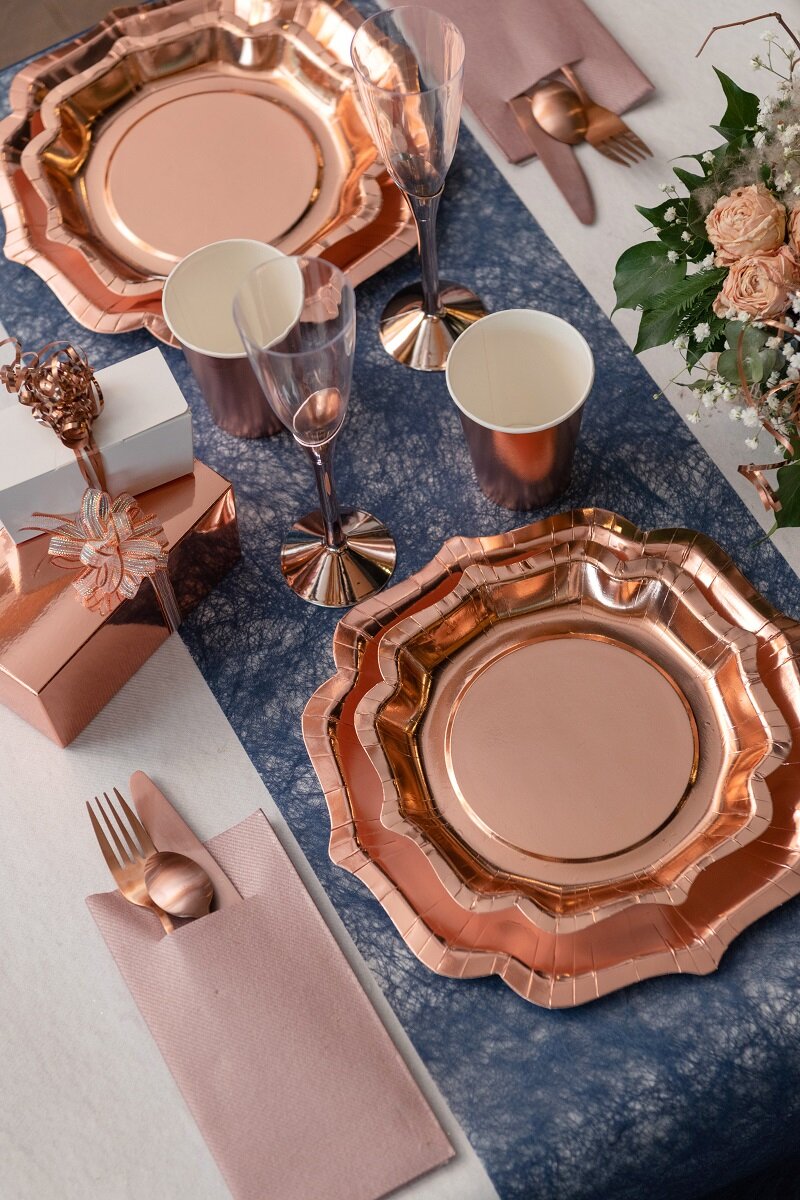 Creëer een stijlvolle tafelsetting met deze roségoudfolie borden die perfect zijn voor verjaardagen, doopfeesten, babyshowers, Nieuwjaar, bruiloften en andere feestelijke gelegenheden. De glanzende roségoudkleur geeft de tafelsetting een elegante uitstraling en tilt de hele tafel moeiteloos naar een hoger niveau.