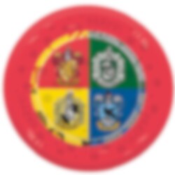 Breng een vleugje magie naar het kinderfeestje met deze kleurrijke kunststof borden met Harry Potter. De afbeelding toont de vier afdelingen Gryffindor, Slytherin, Hufflepuff en Ravenclaw in vier duidelijke vlakken, omringd door een rode rand die de borden extra opvallend maakt.