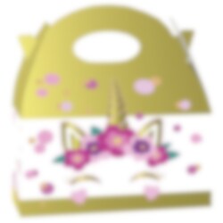 Deze eenhoorn-feestbox is perfect om magie te verspreiden op het kinderfeestje! Vul het met snoep en verrassingen voor een onvergetelijke ervaring. Eenvoudig te monteren, gemaakt van karton en meet 20 x 16 cm. Verkocht per stuk.