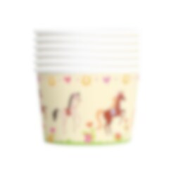 Serveer ijs of lekkernijen in deze schattige bekers met paardenthema. Met kleurrijke paarden, bloemen, hartjes en hoefijzers roepen ze de sfeer op van een zonnige dag op het platteland – ideaal voor kinderfeestjes met een stalthema.
