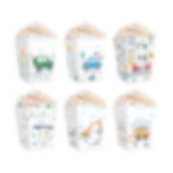 6 popcornbakjes met coole voertuigmotieven, perfect voor het serveren van popcorn of andere snacks.