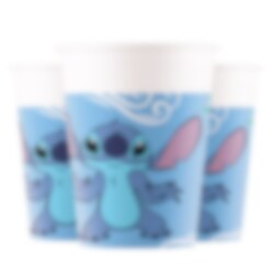 8 papieren bekers met schattige afbeeldingen van Stitch en Angel uit Disney’s Lilo & Stitch. De bekers zijn ca. 10 cm hoog en hebben een inhoud van ca. 200 ml, perfect voor ranja of frisdrank tijdens een kinderfeestje.