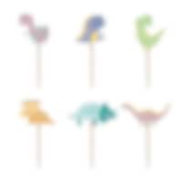 6 kleurrijke kartonnen rietjes versierd met grappige dinosaurussen. De rietjes zijn ongeveer 20 cm lang en de afbeeldingen hebben een diameter van ongeveer 4 cm.