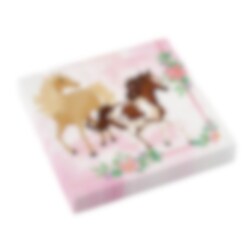 20 servetten in roze- en wittinten met aan beide zijden afbeeldingen van prachtige paarden en kleurrijke bloemen langs de randen. De servetten zijn tweelaags en hebben een uitgevouwen formaat van 33 x 33 cm.
