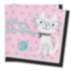 16 roze en zwarte servetten met aan de ene kant een afbeelding van een kat met een bril en de tekst 'Happy Birthday'. De servetten zijn tweelaags en hebben een uitgevouwen formaat van 33 x 33 cm.