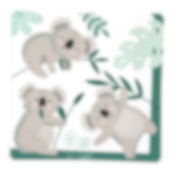 16 servetten in groen en wit met schattige afbeeldingen van koala's. Een leuk tafelaccessoire voor een kinderfeestje met een koala- of dierenthema. De servetten zijn tweelaags en hebben een uitgevouwen formaat van 33 x 33 cm.