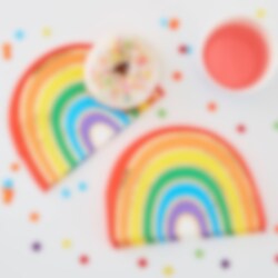 16 mooie servetten in de vorm en kleuren van de regenboog met goudfolie strepen. De servetten hebben 2 lagen en zijn 20 x 15 cm.