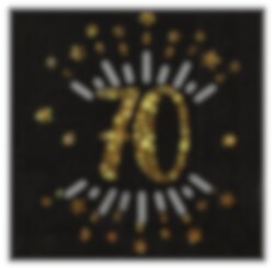 10 zwarte servetten met decoratieve patronen en het getal '70' in goudglitter. Deze servetten zijn perfect voor het dekken van een feest ter ere van een 50e verjaardag. De servetten hebben drie lagen en voelen luxe aan. Uitgevouwen hebben ze een afmeting van 16,5 x 16,5 cm.