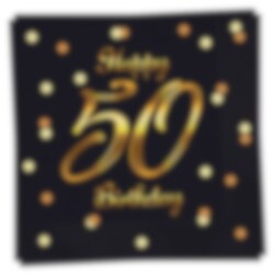 20 st. svarta servetter med guldmotiv och siffrorna 50. Servetterna passar utmärkt när du vill duka fint inför 50-årsdagen. Utvikta så är de 33 x 33 cm stora.