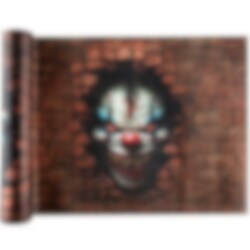 Zwarte tafelloper met een decoratief Killer Clown-patroon, versierd met griezelige clowns die uit de muren lijken te komen. Perfecte decoratie voor op tafel tijdens een Halloweenfeest.