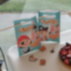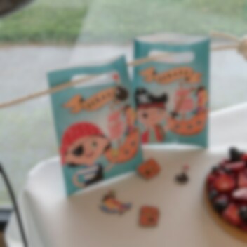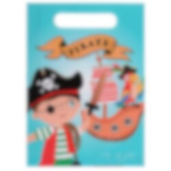 10 uitdeelzakjes van glanzend iets dikker papier met motieven van een piraat en een piratenschip. Perfect ding om uit te delen aan je vrienden op het kinderfeestje gevuld met snoep en klein speelgoed.