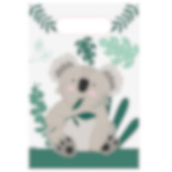 8 uitdeelzakjes in wit en groen met een schattige afbeelding van een koala tussen groene bladeren. Vul de zakjes met lekkers en speelgoed en geef ze vervolgens aan vriendjes en vriendinnetjes tijdens het koala-kinderfeestje.