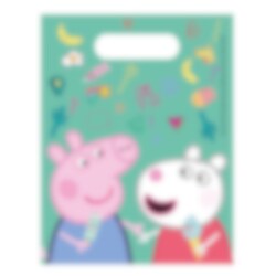 6 stuks uitdeelzakjes in een mooie mintgroene kleur met een kleurrijk motief van Peppa Pig en haar vriendin Suzy uit de tv-serie Peppa Pig. Vul de zakjes met snoep en verrassingen en geef ze vervolgens aan je vrienden tijdens het kinderfeestje.