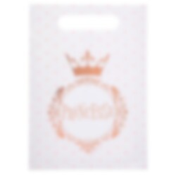 10 stuks uitdeelzakjes van glanzend, iets dikker papier in witte kleur en met motieven van kleine lieve kroontjes en de tekst "Princess" in roségoudfolie. Aan de andere kant van de kinderfeestjetas zit ook een lijn waar je de naam van het kind of een leuk woord op kunt schrijven. Perfect om de favoriete snoepjes en speelgoed van de kinderen mee te vullen als het tijd is voor een kinderfeestje met een magisch prinsessenthema.