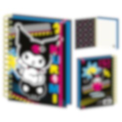 Het notitieboek heeft een zwarte kaft met kleurrijke details in roze, blauw en geel en een afbeelding van Kuromi in haar typische stijl. Met spiraalbinding en gelinieerde pagina’s, ideaal voor school, werk of creatieve ideeën.
