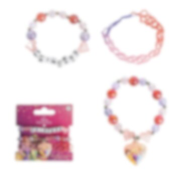 3 armbandjes in prachtige kleuren met afbeeldingen van de bekende Disney prinsessen. Een vrolijke aanvulling voor elke jonge fashionista die van accessoires houdt. Perfect om elke outfit een speels en kleurrijk tintje te geven. Kindermaat.