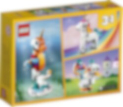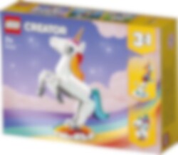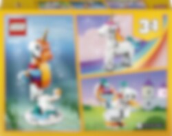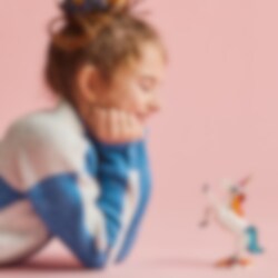 Neem fantasierijke kinderen van 7 jaar en ouder mee een mythisch land voor een bijzondere speelervaring met deze 3-in-1 Magische eenhoorn (31140) bouwset. Het model bevat een eenhoorn met een gouden hoorn, een kleurrijke staart en verstelbare poten en hoeven. Hij kan worden neergezet in 2 posities: op 4 poten of rechtop op zijn 2 achterpoten op de meegeleverde regenboogstandaard. Bouw kleurrijke dieren van LEGO® stenen De belevenissen houden nooit op met de 3 verschillende wezens die jonge bouwers kunnen maken met deze LEGO Creator 3in1 set. Ze kunnen een verstelbare magische eenhoorn bouwen en die ombouwen tot een verstelbaar zeepaardje op een zeebodemstandaard of een verstelbare magische pauw met een kleurrijke staart – of de stenen gebruiken om zelf een ander betoverend wezen te bedenken. LEGO Builder app Download de LEGO Builder app en betreed een nieuwe wereld vol bouwplezier. Hiermee kunnen kinderen inzoomen en hun modellen draaien in 3D, sets opslaan en hun voortgang bijhouden.