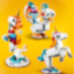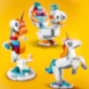 Reis naar verre mythische landen voor urenlang speelplezier met deze mooie wezens. Kijk toe terwijl een spectaculaire magische eenhoorn met een gouden hoorn door een regenbooglandschap draaft. Voor nog meer betoverende taferelen kun je het model ombouwen tot een zeepaardje die boven de zeebodem zwemt of het veranderen in een schattige pauw met een staart vol kleurrijke veren. De keuze is aan jou met deze 3-in-1 set.