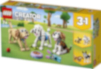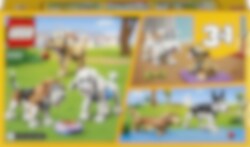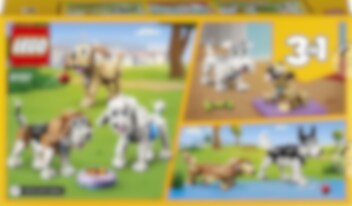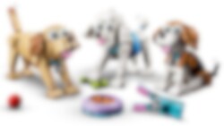 Hondenliefhebbers en kinderen van 7 jaar en ouder kunnen heerlijk spelen met een aantal leuke rashonden in deze LEGO® Creator 3in1 Schattige honden (31137) bouwset. De set bevat een beagle, een poedel en een labrador met verstelbare kop, staart en oren, plus accessoires waaronder een etensbak, een borstel, een speelgoedkonijn, een bal en een hondenriem om iets extra's toe te voegen aan de fantasierijke verhalen van kinderen. Cadeau-idee voor hondenliefhebbers Er komt nooit een einde aan de hondenavonturen met de 3 groepjes honden die je kunt bouwen met deze geweldige LEGO Creator 3in1 speelset. Kinderen kunnen een beagle, een poedel en een labrador bouwen en het drietal vervolgens ombouwen tot een speelse schnauzer en een mopshond of ze veranderen in een husky en een langharige teckel. LEGO Builder app Download de LEGO Builder app en betreed een nieuwe wereld vol bouwplezier. Hiermee kunnen kinderen inzoomen en hun modellen draaien in 3D, sets opslaan en hun voortgang bijhouden.