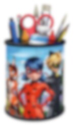 3D-puzzel in de vorm van een pennenbak met een Miraculous Ladybug-motief die na voltooiing als decoratie op je bureau kan worden gebruikt. De 3D puzzel is ongeveer 9 cm hoog. Voor deze puzzel is geen lijm nodig, gewoon bouwen.