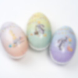 Deze 15 cm grote paaseieren zijn verkrijgbaar in prachtige pastelkleuren en versierd met schattige konijnenmotieven. Ze zijn het perfecte paasgeschenk voor zowel kinderen als volwassenen.