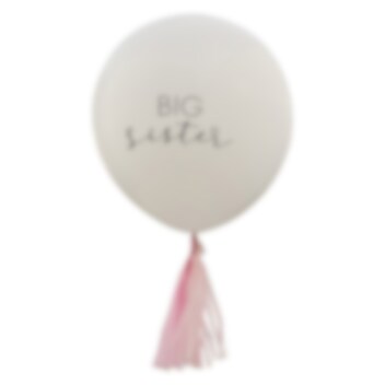 Grote witte ballon met de tekst ''Big Sister'' en voorzien van leuke roze kwastjes. De ballon wordt 45 cm in diameter als hij wordt opgeblazen en je krijgt 2 stuks. roze kwastjes.