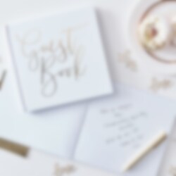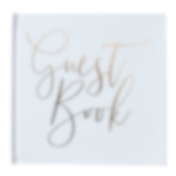 Mooi gastenboek van met harde kaft in wit en bedrukte goudfolie tekst. Het gastenboek bestaat uit 32 blanco pagina's en is ongeveer 20 x 20 cm groot. Het boek kan met voordeel gebruikt worden bij zowel doop als babyshower.