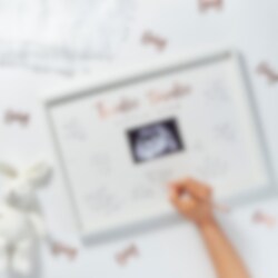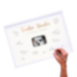 Superlekker gastenboek en cadeau voor babyshower of doop. Plaats een foto en schrijf overal berichten en goede wensen. De lijst is wit met roségouden folie tekst en is ongeveer 32 x 44 x 2 cm. Groot.