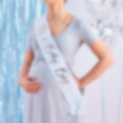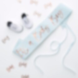 Mooie lichtblauwe sjerp met de tekst It's a Baby Boy in roségoud om door de aanstaande moeder te dragen bij de babyshower! De sjerp is 75 cm (van schouder tot heup) en 10 cm breed.