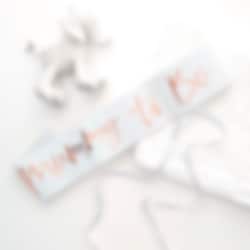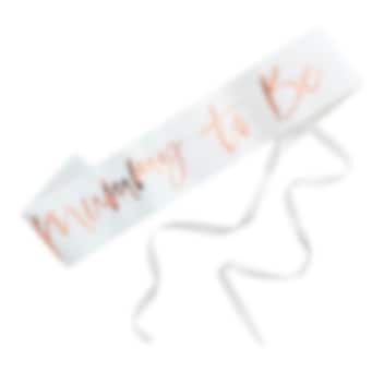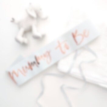Mooie sjerp voor de moeder om te dragen bij de babyshower. De sjerp is wit en de tekst is gemaakt van folie in roségoud. en het is ongeveer 75 cm lang en 10 cm breed.