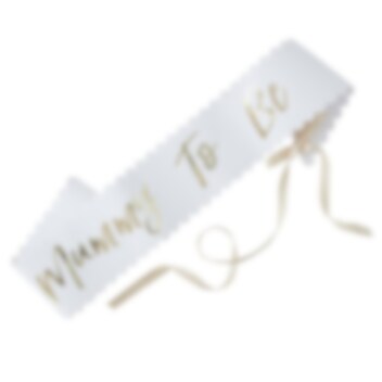 Chique sjerp voor de moeder om te dragen tijdens de babyshower. De sjerp is wit en de tekst is in goudfolie. Het is ongeveer 75 cm lang en 10 cm breed.