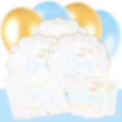Vier de bijzondere momenten met dit complete feestpakket voor babyshowers of doopfeesten! Het pakket bevat 10 luxe bordjes met goudfolierand (21 x 21 cm), 10 schattige papieren bekers (270 ml) en 20 mooie servetten met de tekst "Boy" (33 x 33 cm), perfect voor een feestelijke en stijlvolle gelegenheid.