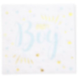 20 servetten in een witte kleur met fijne details in lichtblauw en goudfolie details met de tekst Baby Boy. Super stijlvol om te zetten bij je doop of als je een kersverse moeder gaat verrassen met een babyshower.