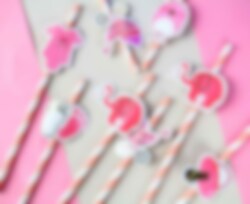 8 kartonnen rietjes in zoet roze babyshower thema. De rietjes zijn ongeveer 20 cm lang en zijn versierd met fopspenen, babyvoetjes, olifanten, kinderwagens en babykleertjes.