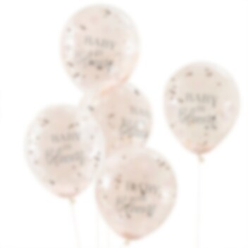 5 stuks latex ballonnen met motieven van de woorden "Baby in Bloom" aan de buitenkant en die ook gevuld zijn met roségouden folie confetti. Versier de kamer hiermee om het extra feestelijk te maken voor de babyshower. De ballonnen hebben een diameter van ongeveer 30 cm wanneer ze zijn opgeblazen en kunnen worden opgeblazen met gewone lucht of helium.
