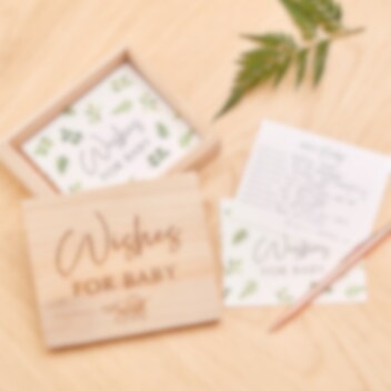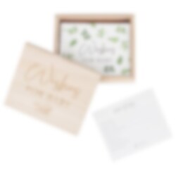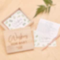 Houten kist gevuld met kaartjes uit de Botanical Baby collectie. Laat de gasten van de babyshower een goed advies op de kaartjes schrijven en geef het dan als verrassing aan de aanstaande of kersverse moeder.