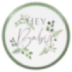 8 groen-witte papieren bordjes uit het Botanical Baby thema met motieven van takjes en bladeren en de tekst "Hey Baby" in een donkergrijze kleur. Perfect om op te nemen in de tafelaankleding voor de babyshower of doop. De bordjes zijn milieuvriendelijk en hebben een diameter van ongeveer 24 cm.