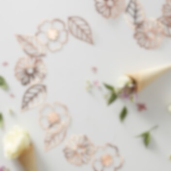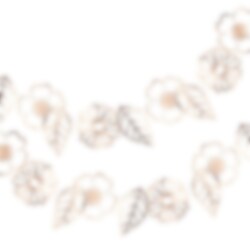 Exclusieve slinger met 18 afbeeldingen van bloemen en bladeren in fijne roségoudfolie. Een indrukwekkende decoratie om mee te nemen naar het feestje of de babyshower. De slinger is ongeveer 3 meter lang.